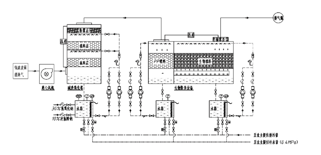 Note: This process is primarily applicable for treating malodorous gases composed of sulfur-containing compounds (H₂S, SO₂, mercaptans, sulfides, etc.), nitrogen-containing compounds (NH₃, trimethylamine, amides, etc.), halogens and their derivatives (chlorine gas, halogenated hydrocarbons, etc.).