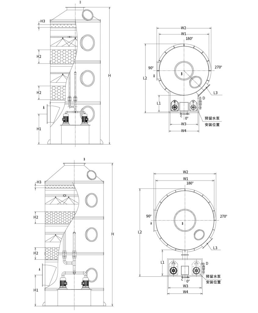 Type 1: Integrated water tank packed spray scrubber (Tower diameter: Φ1000mm-Φ2200mm)